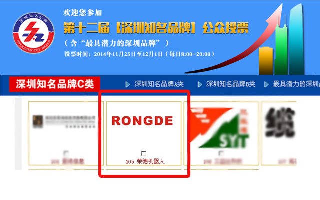 2014年,深圳市榮德機器人科技有限公司作為國家級高新技術企業(yè),廣東省名牌產(chǎn)品,成功入選第十二屆“深圳知名品牌”評選活動,并定于2014年11月25日至12月1日(每天8:00-20:00)進行公眾投票,投票結果直接決定公司是否被評選上。所以特請各位朋友幫忙榮德公司投上一票。謝謝!投票具體規(guī)則如下:
