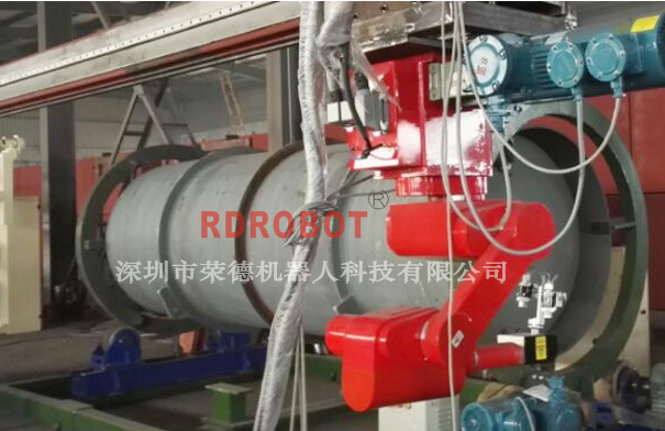 機(jī)器人平移行走,配合機(jī)架整體前后移動(dòng),增大了機(jī)器人噴涂范圍,半徑1.3M的機(jī)器人就可以把整個(gè)產(chǎn)品噴好,適用于大型的、笨重的罐體工件,如下圖所示: