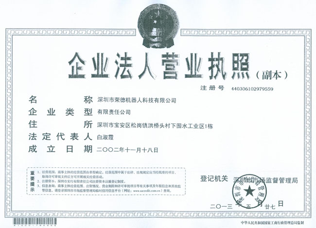 今天,全體榮德人見證了榮德發(fā)展歷史上重要的一刻:本公司由“深圳市榮德機械設備有限公司”正式更名為“深圳市榮德機器人科技有限公司”,注冊資本660萬元。