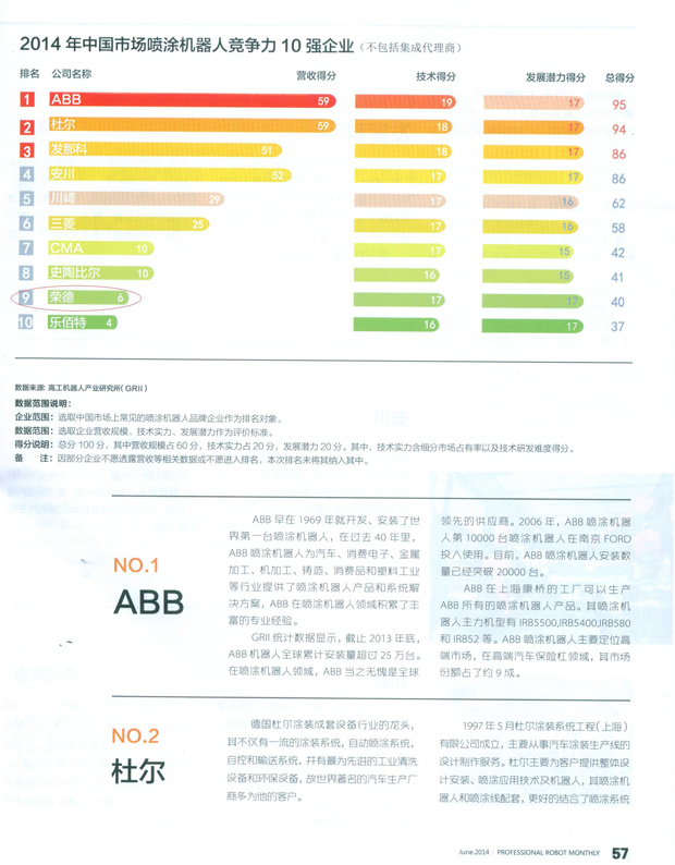日前,國內(nèi)某權威機器人產(chǎn)業(yè)雜志對2014年中國市場噴涂機器人的核心市場競爭力進行了深入了解并根據(jù)各企業(yè)營收、技術、發(fā)展?jié)摿θ椫匾笜诉M行評分,并得出最終排名,榮德公司在所有入圍的十家企業(yè)里面排名第九,排名前八名的均為國外巨頭,榮德公司在中國國內(nèi)的排名中處于第一名的領先地位,這也符合榮德公司“中國噴涂機器人領先品牌”的戰(zhàn)略地位。