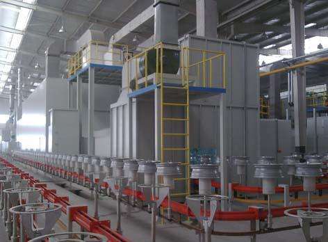 涂裝生產(chǎn)線主要工藝流程是上件→拋丸除銹→清理吹灰→噴鋁→底漆噴漆流平→底漆烘干→中涂噴漆流平→中涂烘干→面漆噴漆流平→面漆噴漆烘干→下件。涂裝線的防腐環(huán)境是室外(不直接淋雨),高架橋腹部波紋板。保護年限為長效型,50年。主要針對工廠構(gòu)件外表面涂漆,不考慮施工后涂裝。前處理拋丸,Sa3.0級、粗糙度/75-120um、清潔度/1級?;耐繉訛殡娀釃婁X,120-150μm;底涂層為環(huán)氧富鋅底漆,60-80μm,90℃60分鐘烘干。中間涂層為環(huán)氧云鐵中間漆,150-180μm;90℃90分鐘烘干。 面漆為丙烯酸聚氨酯或氟碳漆面漆,40-60μm。90℃60分鐘烘干??偲崮ず穸龋骸?50μm。