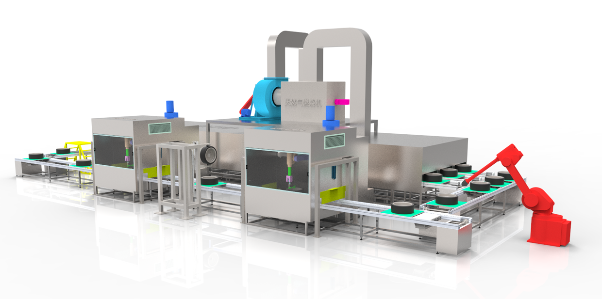 橡膠輪胎機器人自動噴涂線是根據(jù)用戶的產(chǎn)品特點及要求設(shè)計,用于輪胎的噴涂、烘干等工序,產(chǎn)品采用工裝式滑撬線輸送,機器人自動噴涂,機械手自動翻面,減少人工勞動力,提升企業(yè)自動化程度,便于管理。