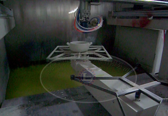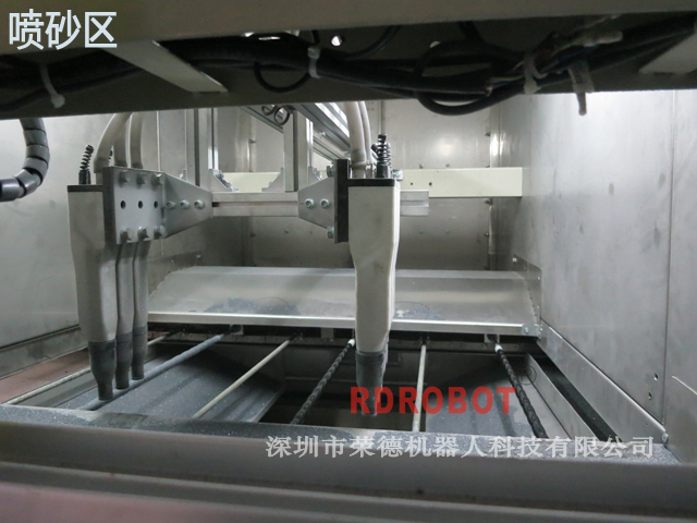 工藝流程:自動(dòng)打毛→上噴膠輸送線→加熱AB膠→自動(dòng)噴膠→自動(dòng)噴砂→機(jī)械手自動(dòng)抓取到排料線→機(jī)械手自動(dòng)抓取到烘干線→烘干—冷卻—下件(非標(biāo)定制)